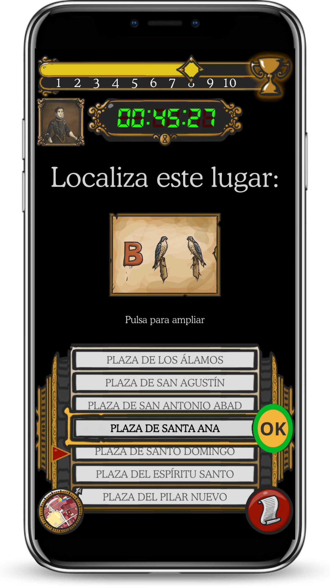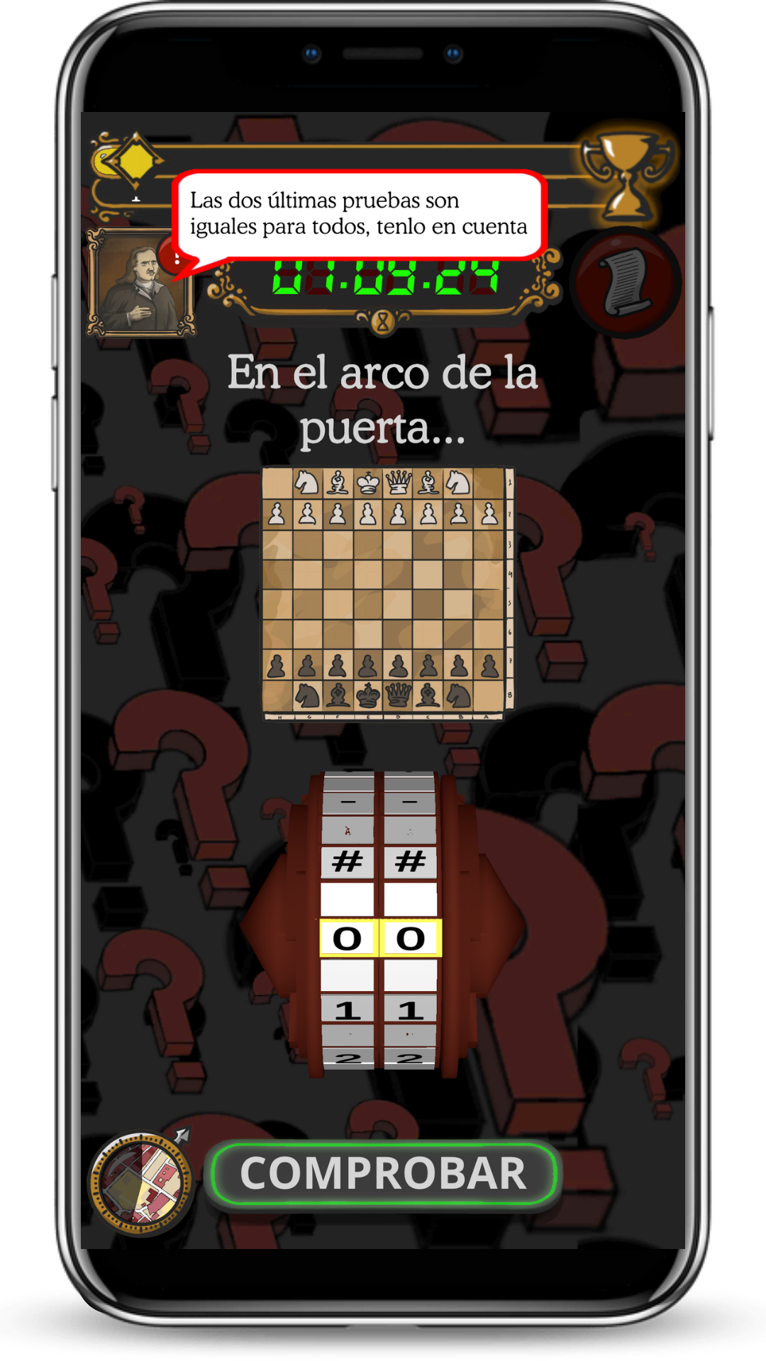 Resuelve puzzles, anagramas, cryptex y adivinanzas para dar con la siguiente localización. La barra superior muestra la posición del equipo rival.